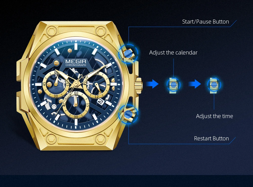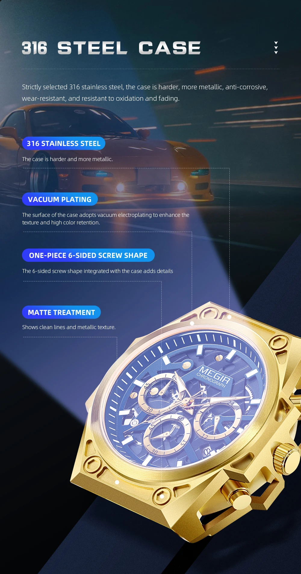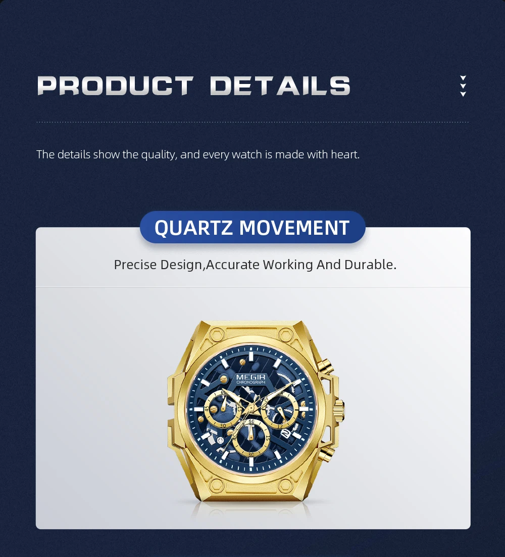 La montre MEGIR pour hommes est bien plus qu'un simple accessoire. Elle représente l'originalité, la précision et le luxe, ajoutant une touche sophistiquée à votre style d'affaires.