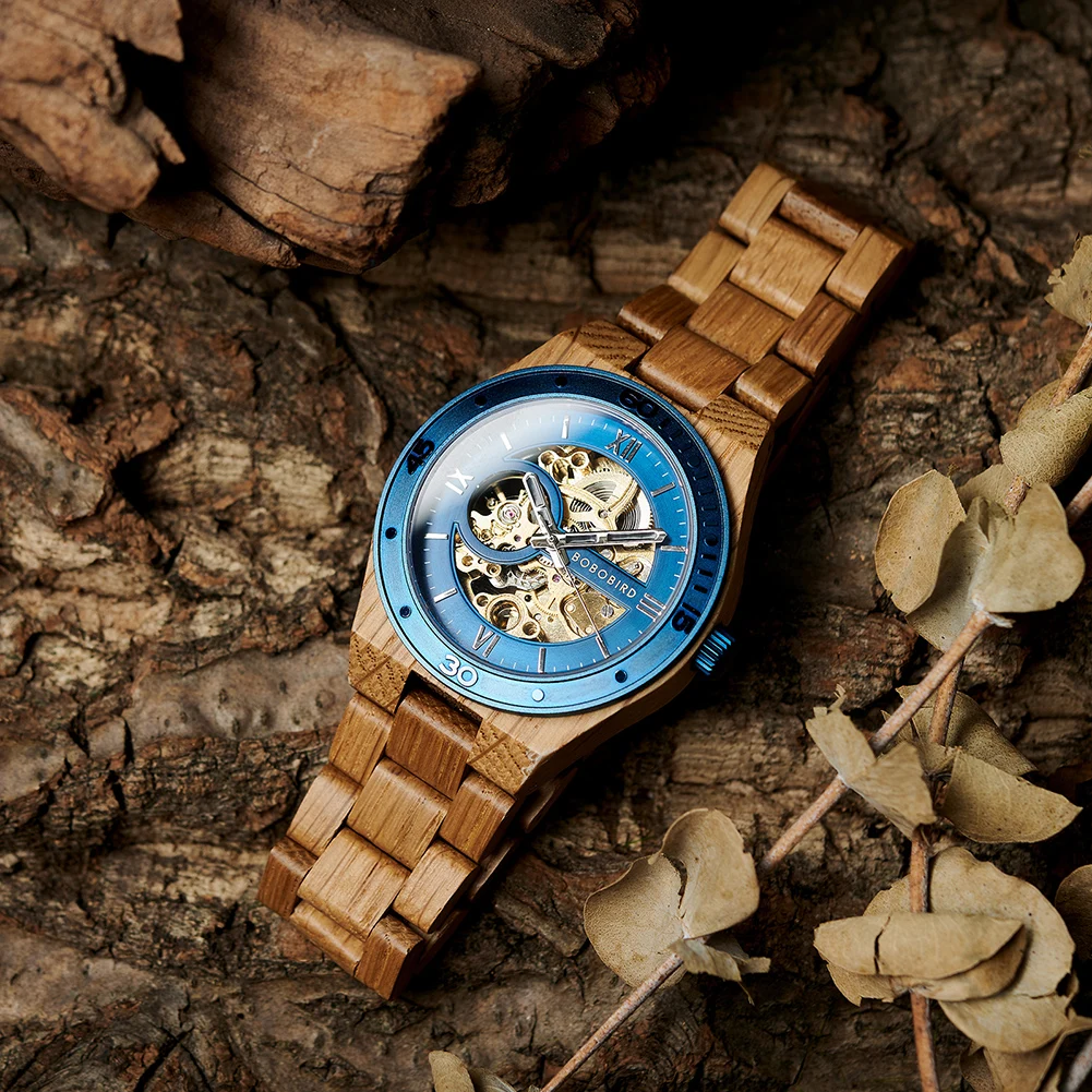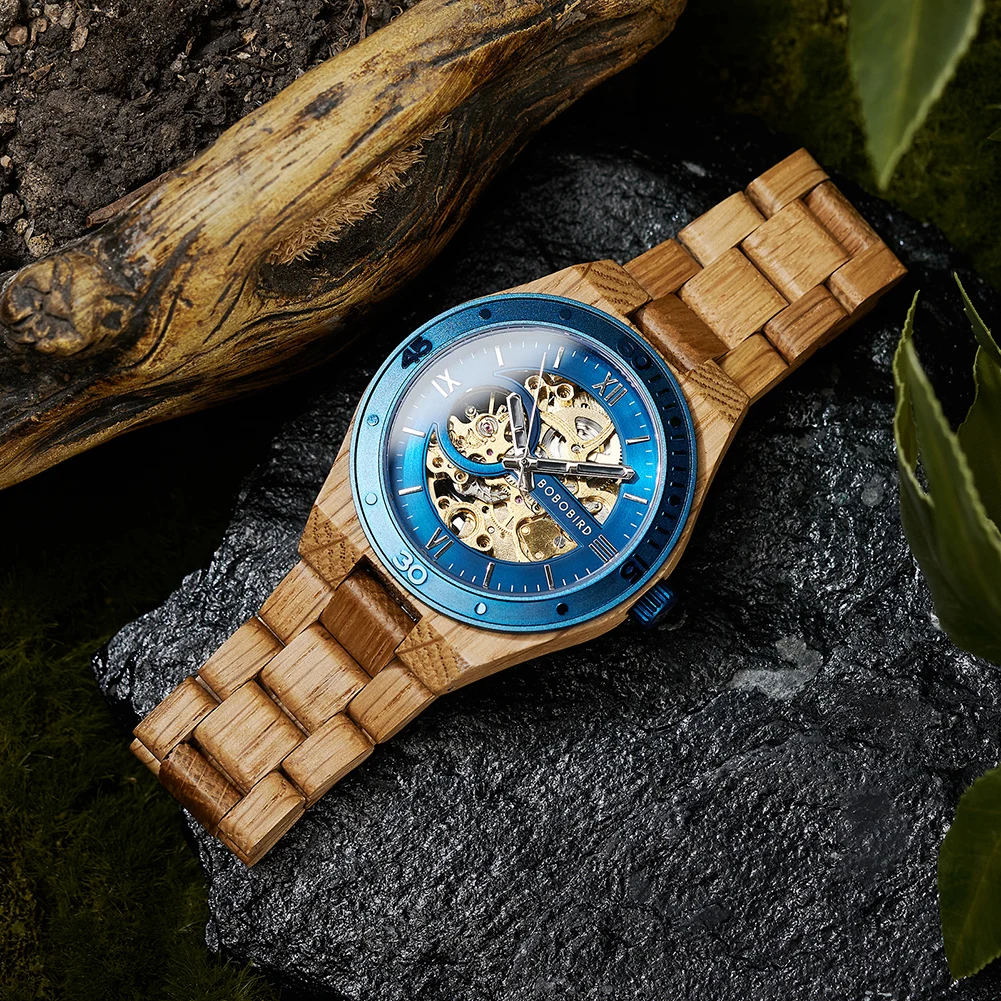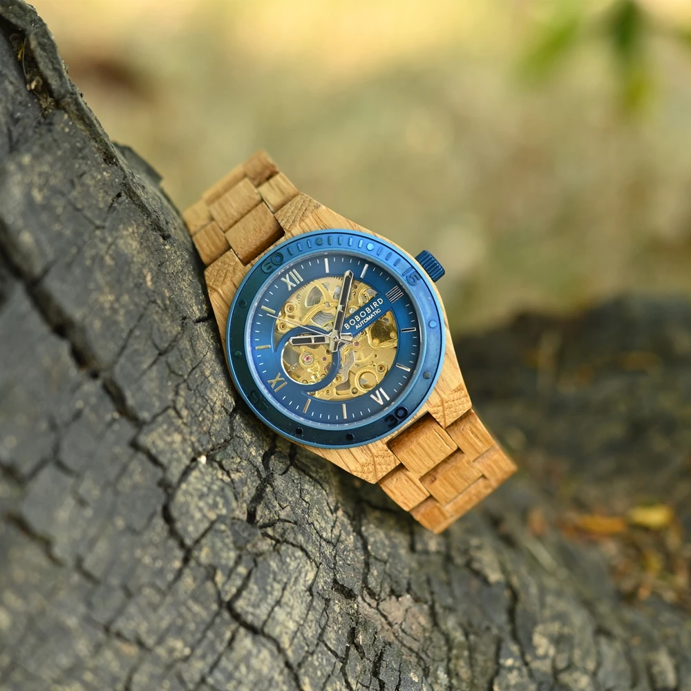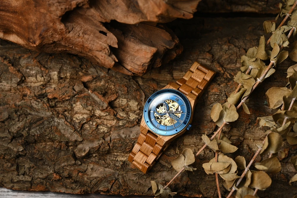 Plongez dans l'élégance naturelle avec notre Montre en Bois d'Érable, une pièce horlogère qui marie à la perfection le charme du bois d'érable à un cadran métallisé bleu éclatant et un mécanisme doré apparent. L'alliance du bois clair de l'érable et du cadran bleu confère à cette montre un style inimitable.