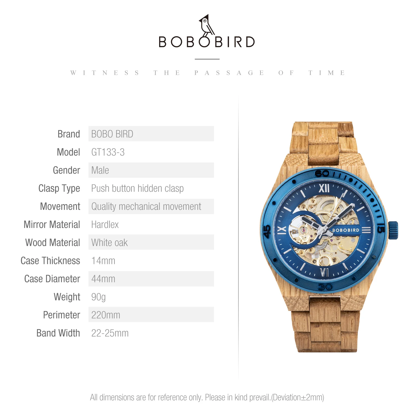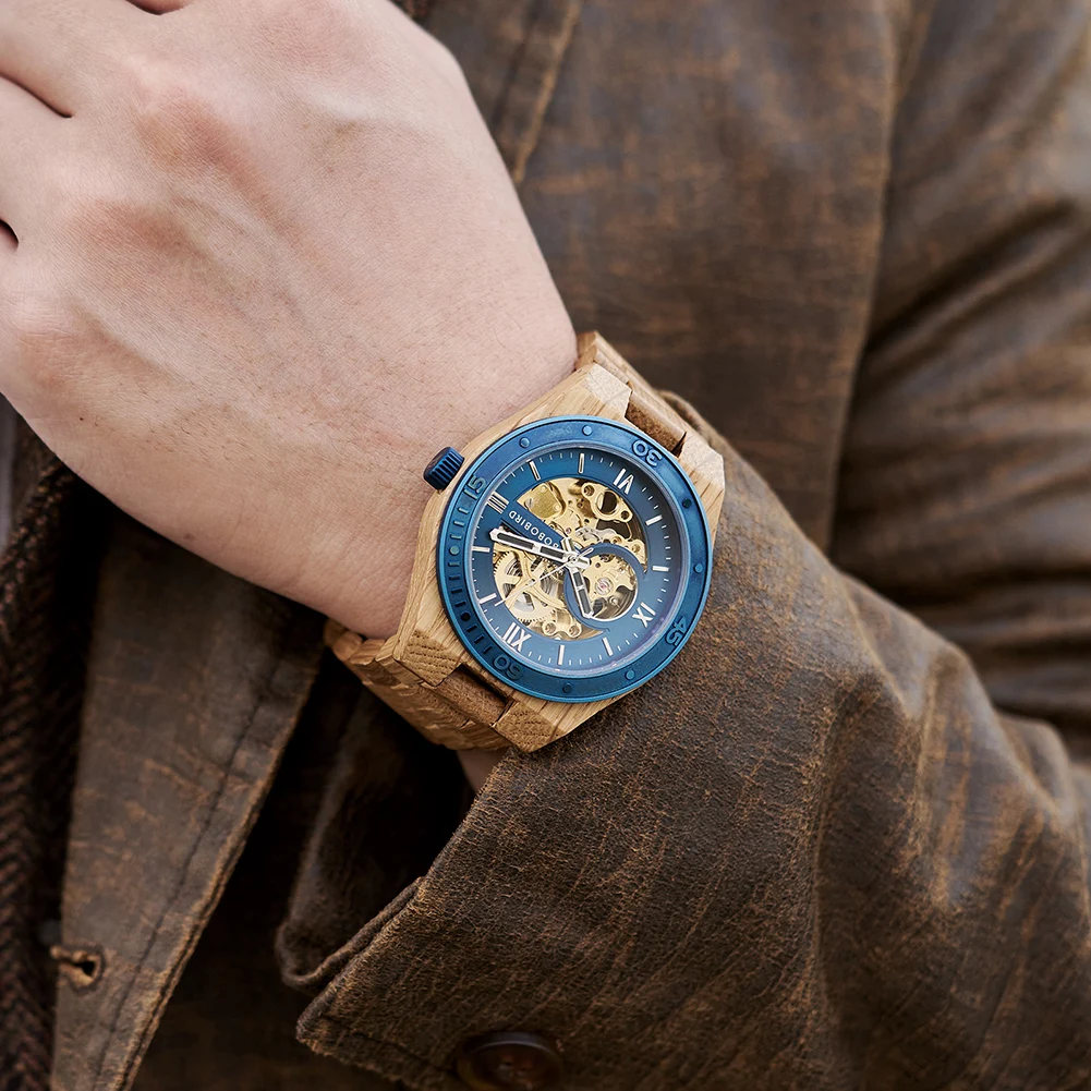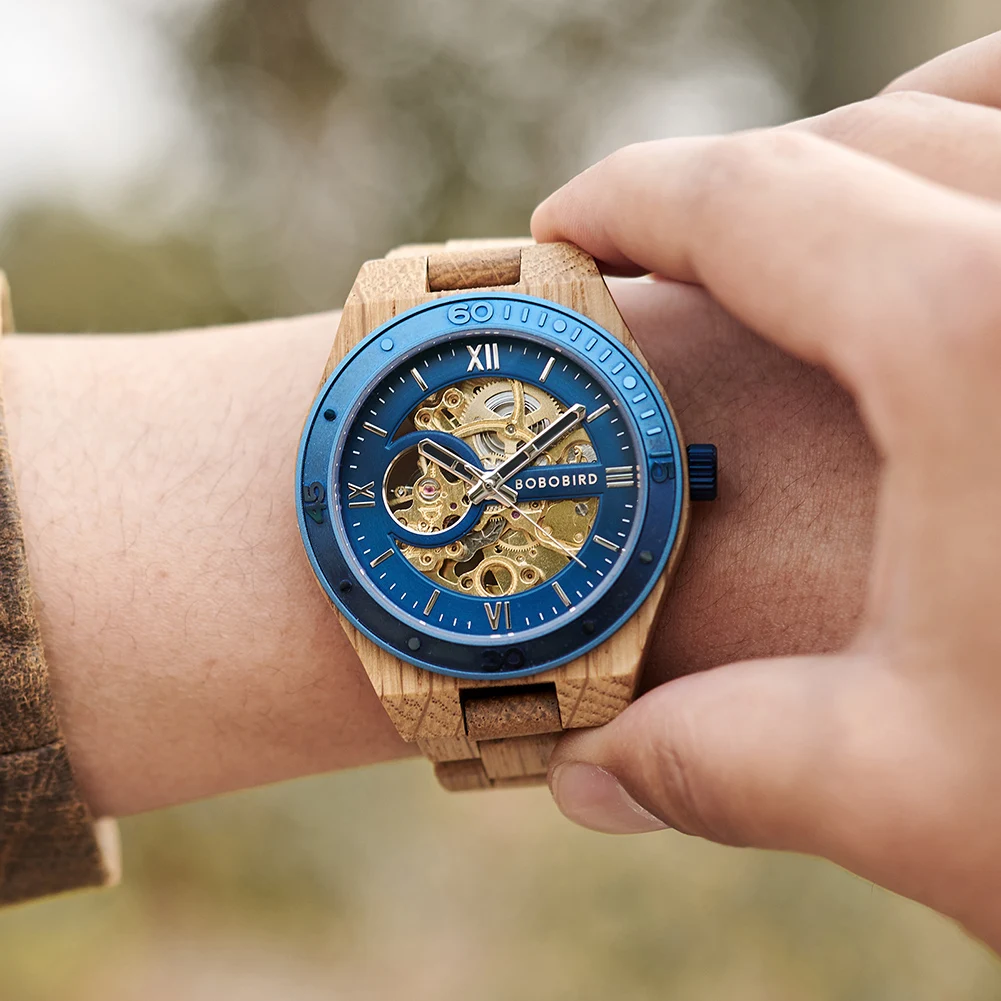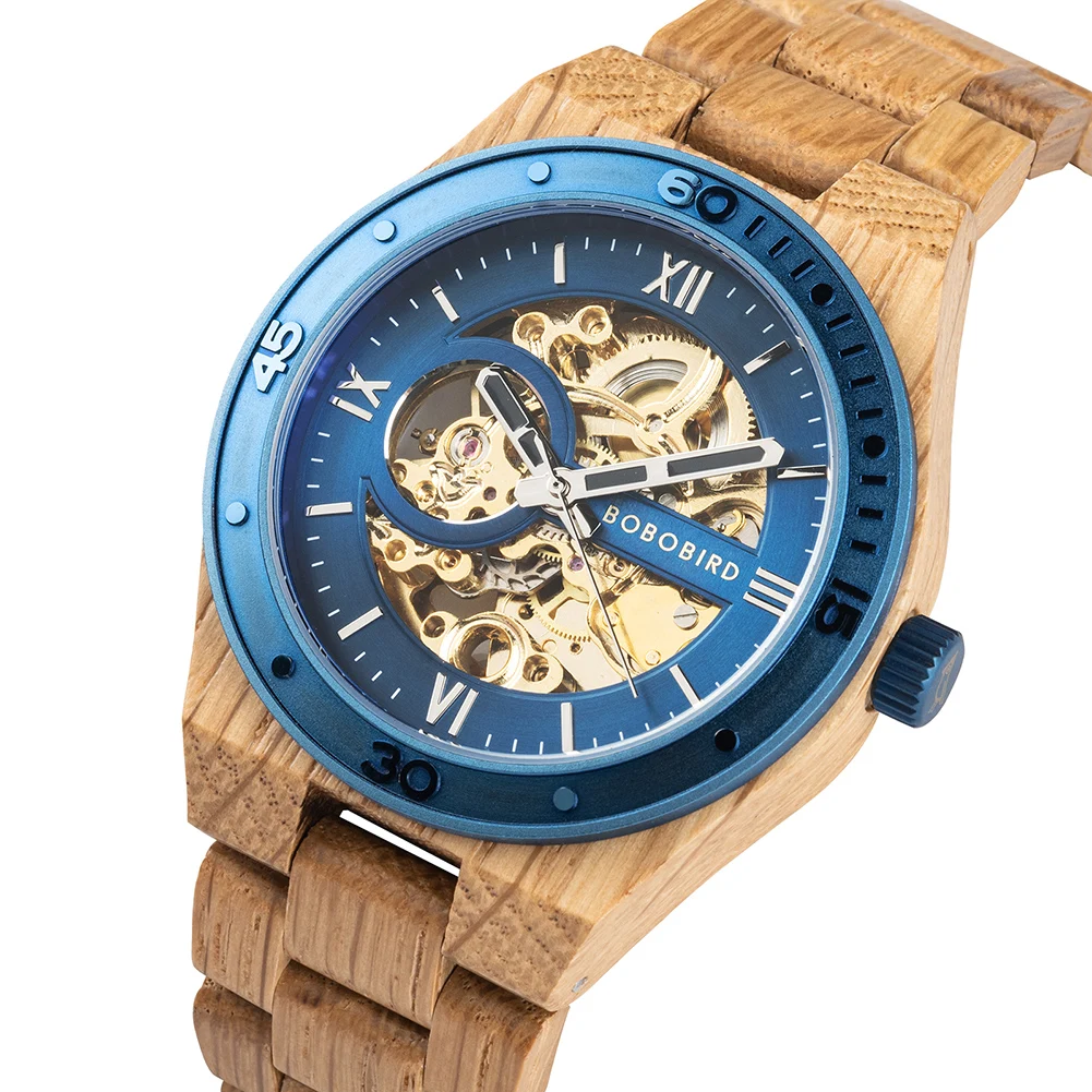 Plongez dans l'élégance naturelle avec notre Montre en Bois d'Érable, une pièce horlogère qui marie à la perfection le charme du bois d'érable à un cadran métallisé bleu éclatant et un mécanisme doré apparent. L'alliance du bois clair de l'érable et du cadran bleu confère à cette montre un style inimitable.