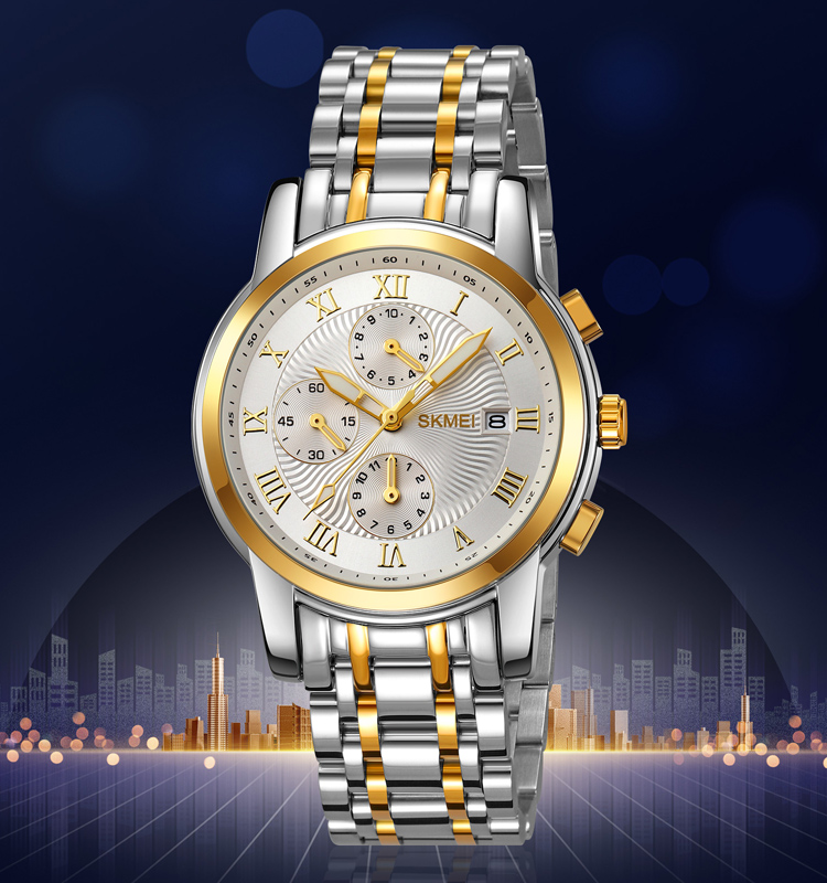 high quality Custom LOGO skmei 2306 Wholesale luxury 3atm Water Resistant date Stainless Steel gold watch men