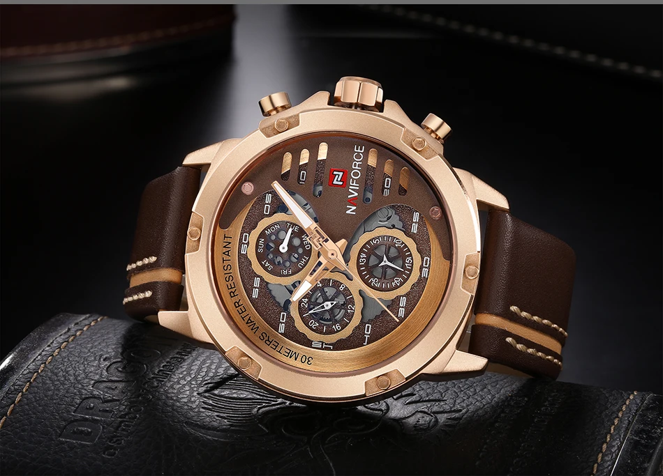 NAVIFORCE – montre à Quartz de luxe pour hommes, grand cadran en cuir véritable