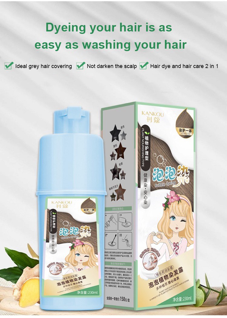 Teinture capillaire à bulles d'extrait naturel de plante, après-shampooing de teinture capillaire à bulles végétales, teinture capillaire naturelle instantanée à bulles végétales, crème de couleur de lavage de cheveux facile à laver, teinture capillaire et soin des cheveux 3 en 1
